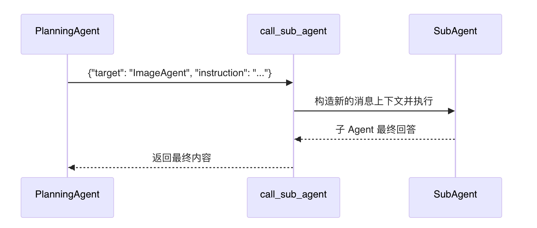 call_sub_agent 将“调用另一个 Agent”抽象成工具调用,使规划 Agent 在同一轮内调用多个 Agent。